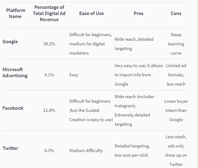 In terms of platforms, there are Google Display Network, LinkedIn, Pinterest, and Instagram.