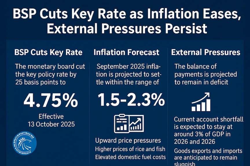 The Bangko Sentral ng Pilipinas (BSP) has lowered its key policy rate by 25 basis points to 4.75 percent, signaling a measured shift toward monetary easing as inflation continues to stabilize and growth risks rise amid persistent global headwinds.