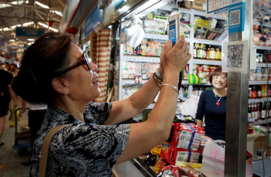 A woman making digital payments at a wet market using a QR code