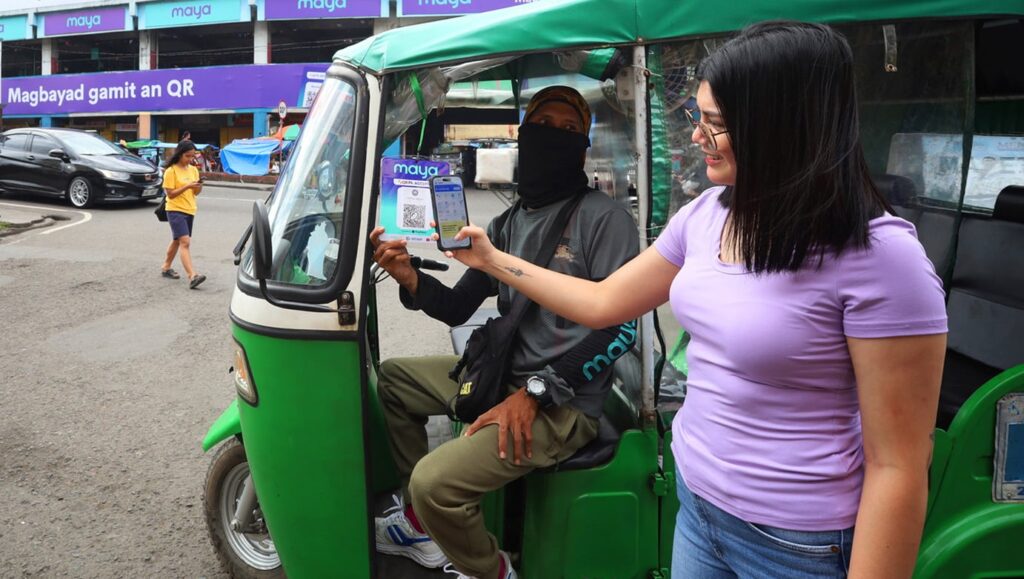 A woman paying for her tricycle fare using an e-wallet app
