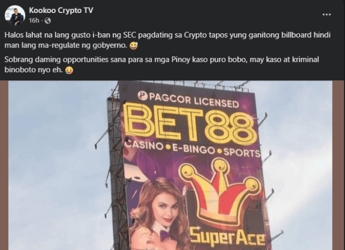 “It seems like the government is more lenient towards gambling, which destroys lives, yet they’re cracking down on crypto, which can help Filipinos grow financially,” one user remarked.