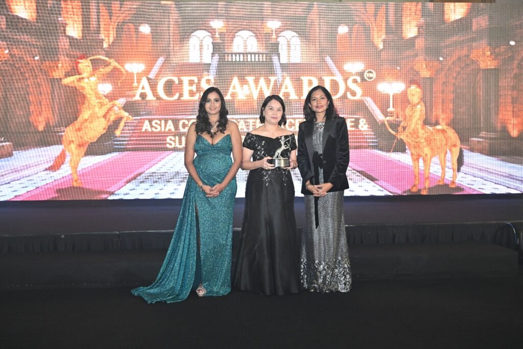 DBP Senior Vice President for Operations Catherine Magana (middle) receives the Top Sustainability Advocates in Asia award under the Sustainability category of the Asia Corporate Excellence and Sustainability (ACES) Awards 2023 during ceremonies held in Kuala Lumpur, Malaysia. Also in the photo were MORS Group Chief Executive Officer Shanggari Balakrishnan (left) and AUBRENS Managing Partner Dr. Jayanthi Desan.