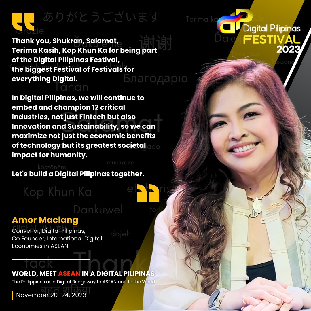 “Thank you, Shukran, Salamat, Terima Kasih, Kop Khun Ka, for being part of the Digital Pilipinas Festival, the biggest Festival of Festivals for everything digital,” she said in her speech.