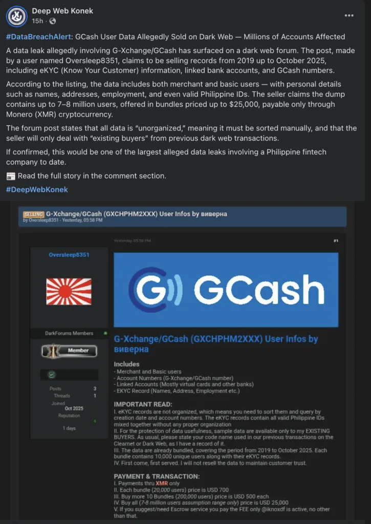 GCash’s internal forensic analysis found no indication of unauthorized access or data exfiltration from its systems. The company said the dataset circulating online does not match GCash’s internal data structure, suggesting that the information likely originated elsewhere.