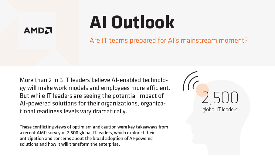 AMD commissioned the survey of 2,500 IT leaders across the United States, United Kingdom, Germany, France, and Japan to understand how AI technologies are re-shaping the workplace, how IT leaders are planning their AI technology and related Client hardware roadmaps, and what their biggest challenges are for adoption.