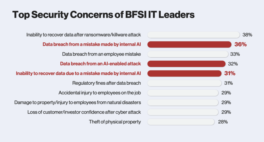 • AI-enabled attacks: Although ransomware attacks are top-of-mind for BFSI IT leaders, 36% cite security breaches caused by AI mistakes as a top concern, and 32% fear AI-enabled attacks.