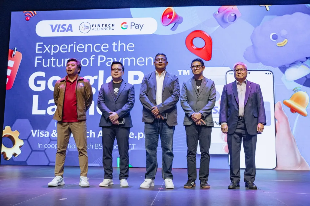 DICT Secretary Henry Aguda (left) leads the launch of Visa Google Pay in BGC. Joining him are Visa Philippines Country Manager Jeffrey Navarro, Fintech Alliance PH Chair Lito Villanueva, Google Payments’ TG Ramakrishnan, and BSP Deputy Governor Mamerto E. Tangonan